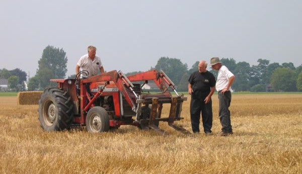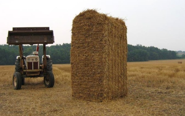 Dry stone artist John Shaw-Rimmington working with two local farmers, Gerry Byers and Joe Beatty began moving and laying out the heavy 8 foot straw bales, using two tractors, pry bars, tapes, levels and spray paint (to mark the proper orientation of the bales). They worked for the better part of the day, in rather humid hazy weather to complete the 32 bale simulation of Stonehenge. The structure looks quite impressive from a distance, as seen from Dale Road.